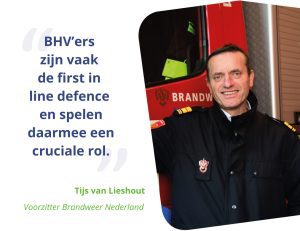 Ambassadeur Tijs van Lieshout, voorzitter Brandweer Nederland, vertelt dat BHV’ers niet alleen bij organisaties en bedrijven onmisbaar zijn, maar ook in het publieke domein. “Als je hebt geleerd om hulp te verlenen, te reanimeren en bepaalde handelingen te verrichten, dan ben je ook buiten de werkvloer een goede hulpverlener. Kijk maar eens om je heen, wie is er kwetsbaar in je eigen buurt of straat?”, aldus Tijs. “Dat is één van de grootste doelstellingen in onze hoofdstad: we willen toe naar 100.000 hulpverleners. En dat is niet voor niets. Er komen dingen op ons af, zoals extreme weersomstandigheden, stroomuitval en andere calamiteiten. Dat gaat gewoon gebeuren en dat moeten we samen opvangen. Je hebt dus mensen in de samenleving nodig die dat mee gaan oplossen. Als je weet hoe BHV werkt en je weet hoe te handelen, dan ben je bereid hulp te verlenen. Uiteindelijk kun je dan deel uitmaken van het leger van hulpverleners die wij in de toekomst nodig hebben.”